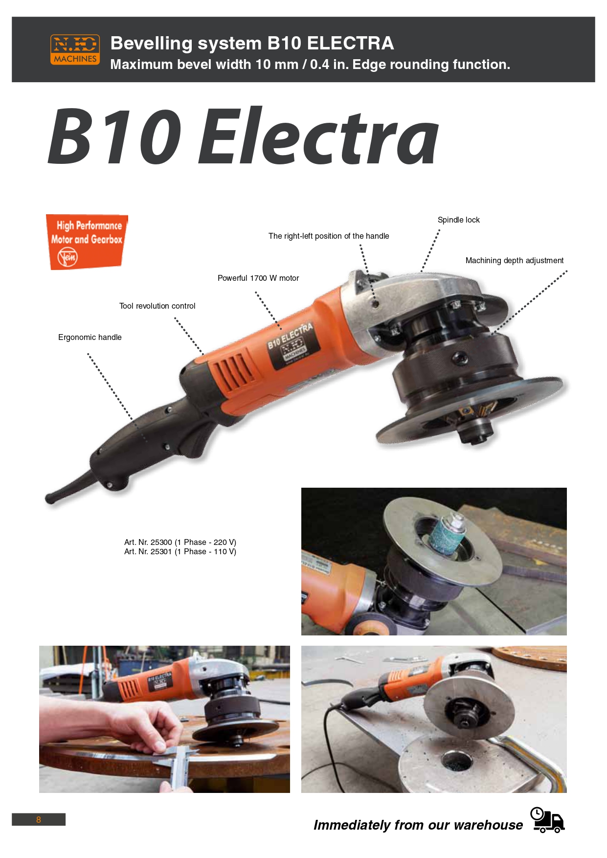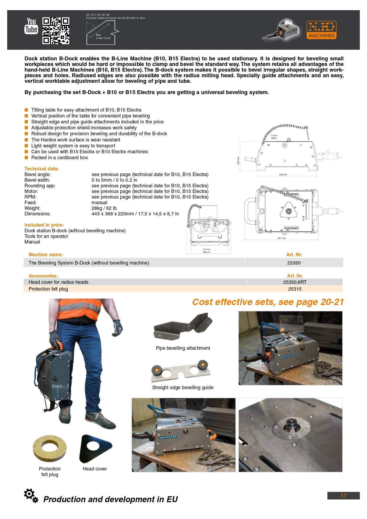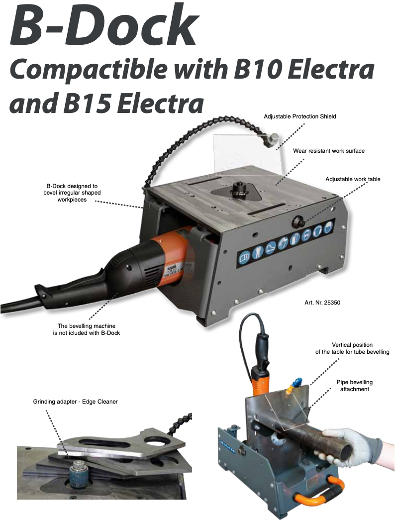 B-Dock tööjaam võimaldab muuta B10 Electra ja B15 Electra käsifaasmismasinad statsionaarseks süsteemiks. See sobib suurepäraselt väikeste ja keerukate detailide täpseks faasimiseks, torude töötlemiseks ja servade ümardamiseks. Vastupidav Hardox-tööpind, reguleeritav töölaud ja kerge konstruktsioon tagavad mugava kasutuse ja kvaliteetse tulemuse.