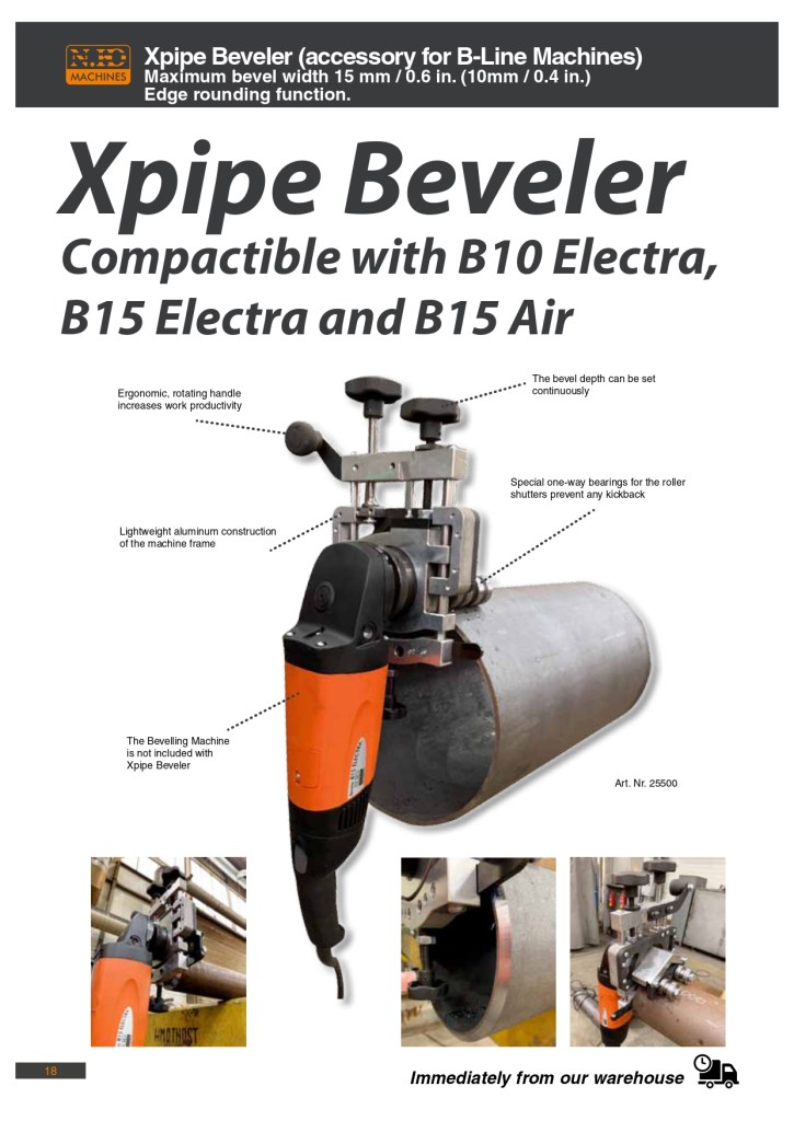 Xpipe Beveler võimaldab B10 ELECTRA-ga töötada torude ja voolikute kallutatud servadega alates Ø 85 mm. Tänu tugevale raamile, spetsiaalsetele rullidele ja sujuvalt reguleeritavale kaldteele saab teha täpseid faase ebatasastele torudele või lehtmetalli servadele, suurendades masina mitmekülgsust tööstuslikes tingimustes.