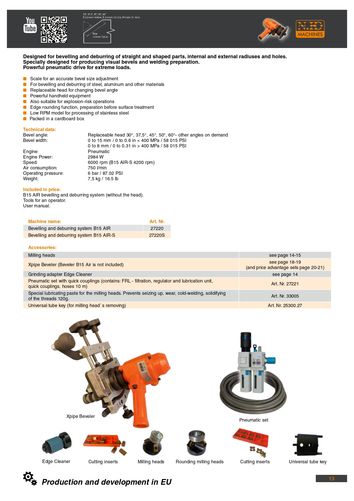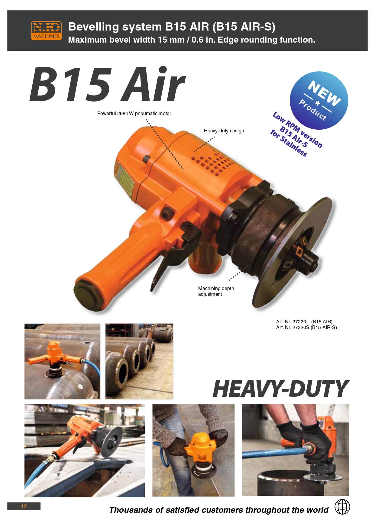 B15 AIR on NKO MACHINES poolt loodud ergonoomiline pneumaatiline faasimasin, mis võimaldab faasida sirgeid servi, kontuure, auke ja raadiuseid. Sobib terase, roostevaba terase, alumiiniumi, vase ja plastiga töötamiseks. Valikus erinevad faasunurgad 30°–60°, täpne seadistus ja suur võimsus tagavad kiire ja täpse töö.