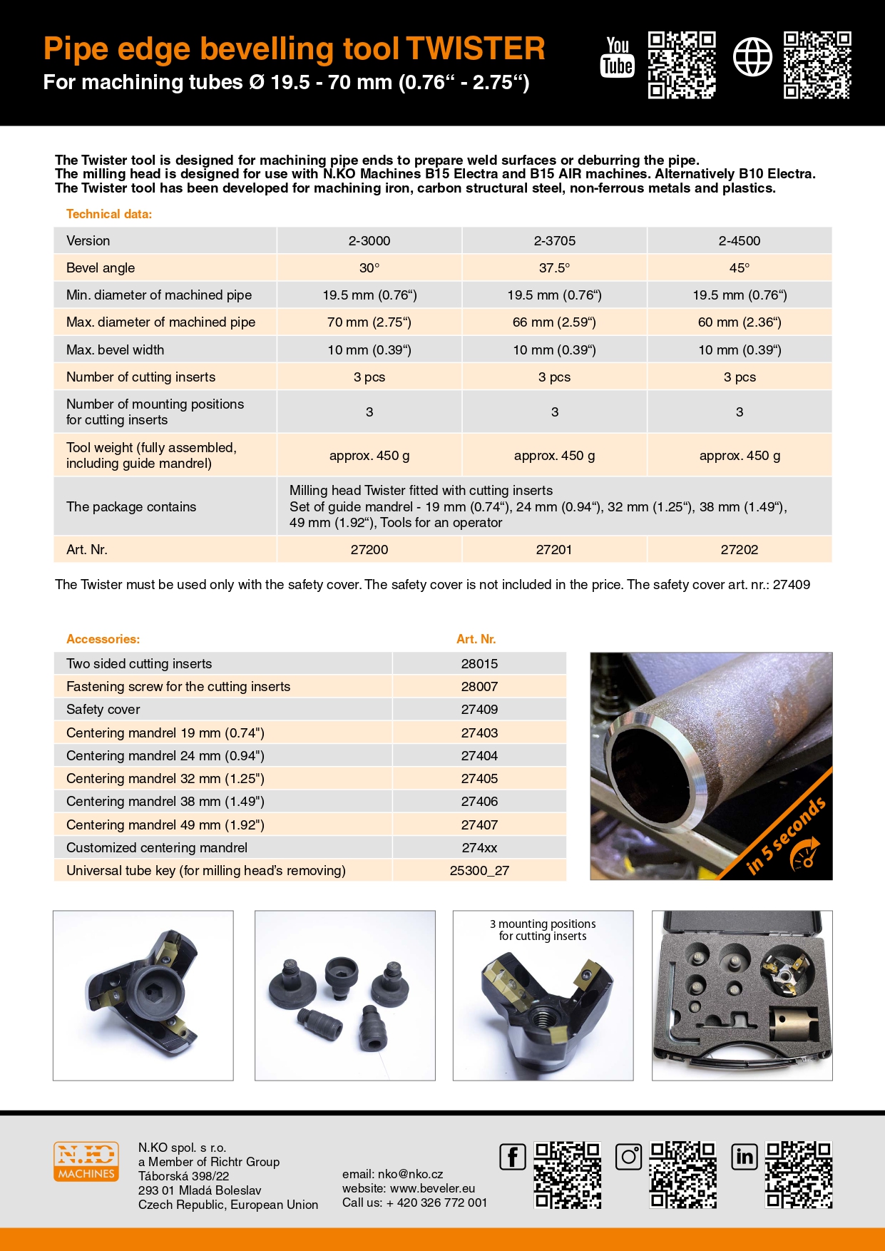 - Töödeldud toru maksimaalne läbimõõt: 60 mm (2,36“)