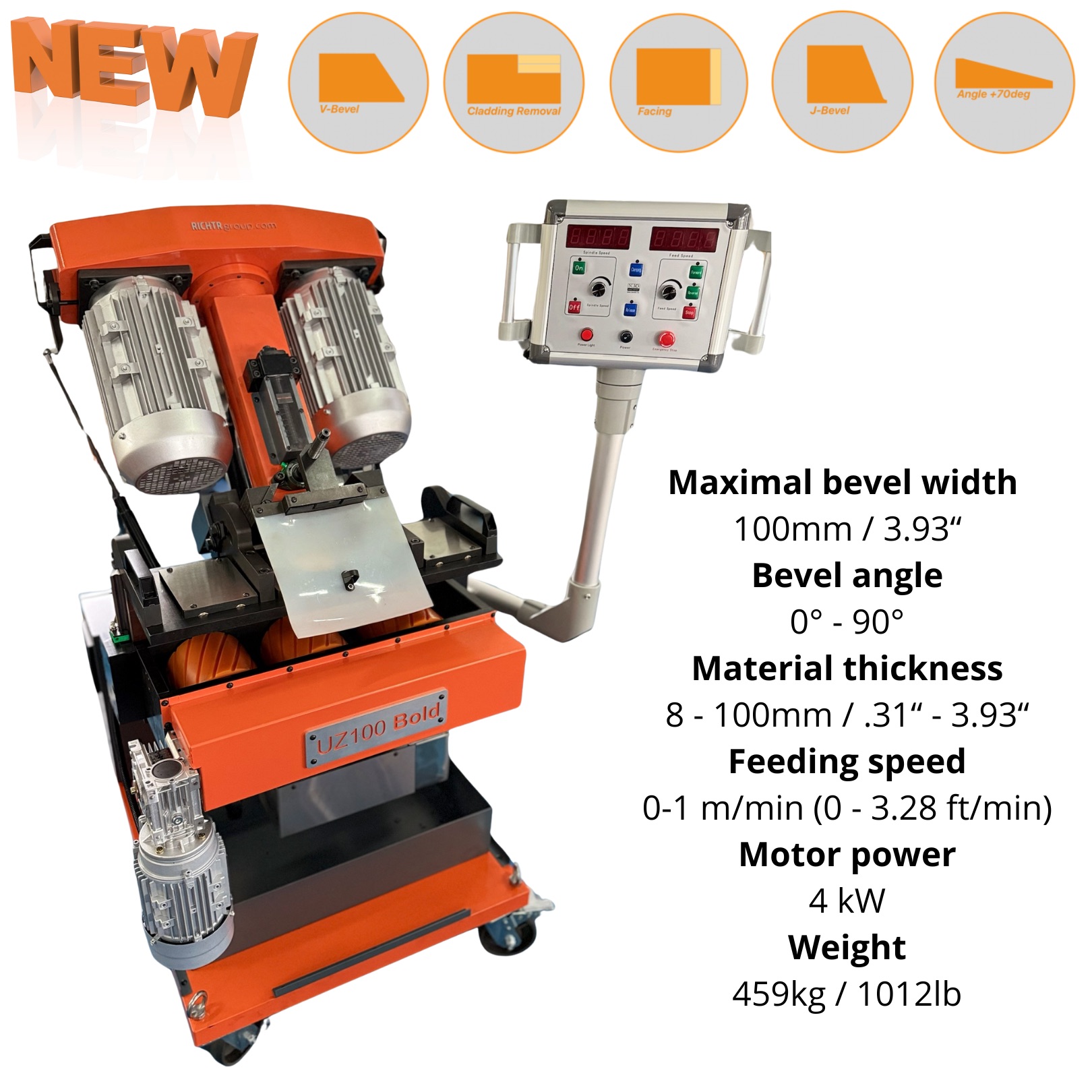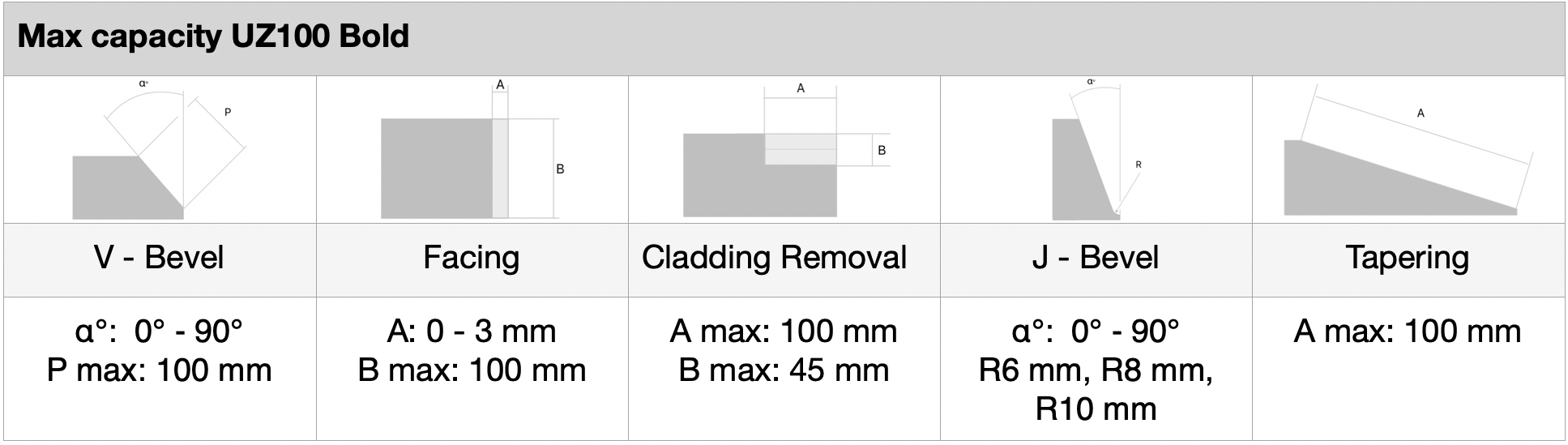 UZ100 BOLD on unikaalne mitmekülgne faasimasin automaatse etteandega, mis sobib V-faaside, J-faaside, katte eemaldamise, tasandamise ja kuni +70° faaside tegemiseks. Masin on mõeldud nii konstruktsiooniterase kui ka tugevamate, raskesti töödeldavate materjalide, näiteks Hardox ja Domex, töötlemiseks.